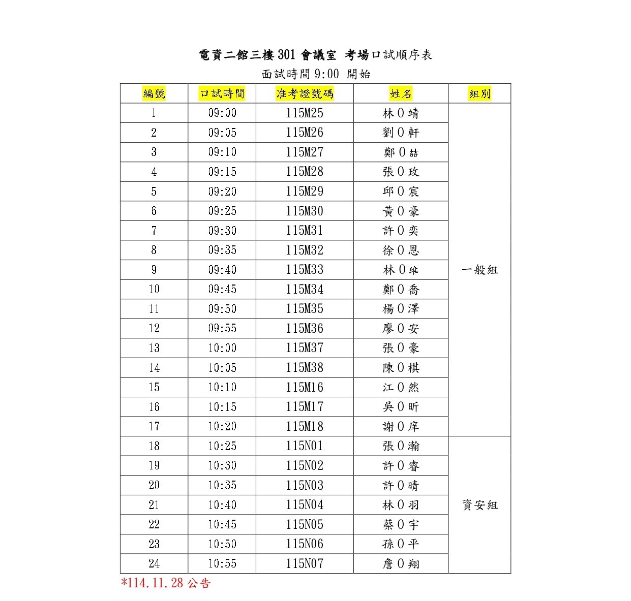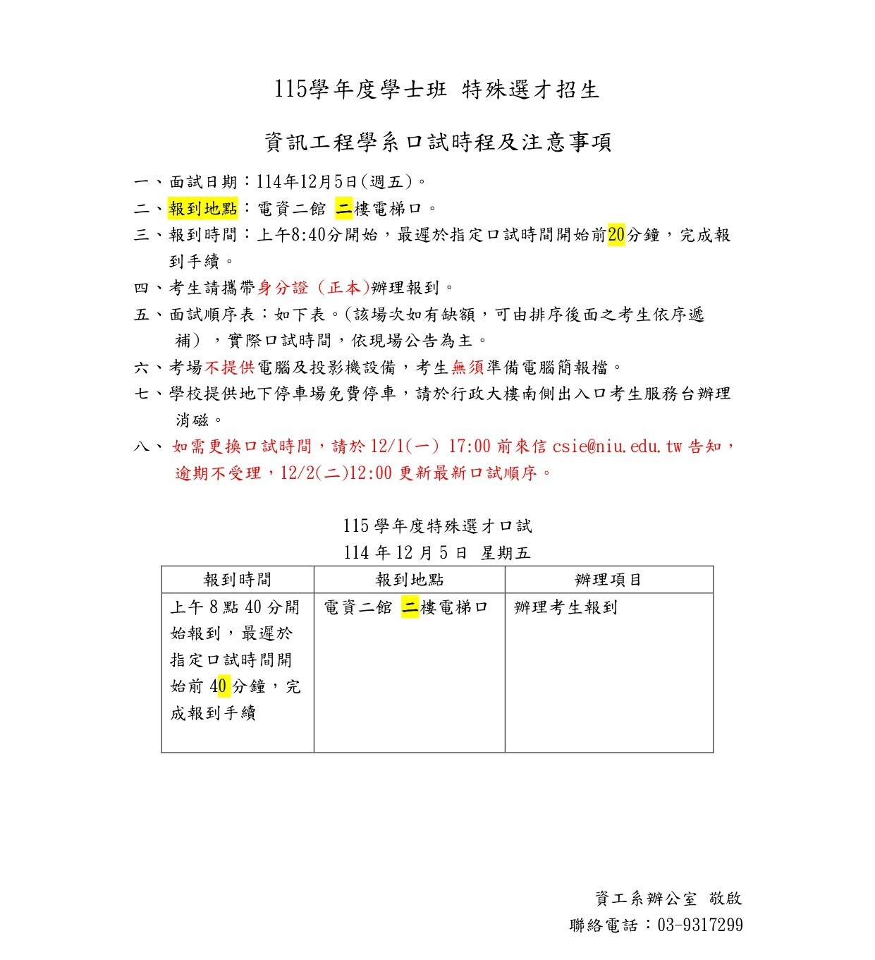 【招生】國立宜蘭大學資訊工程學系學士班115學年度特殊選才口試時間表