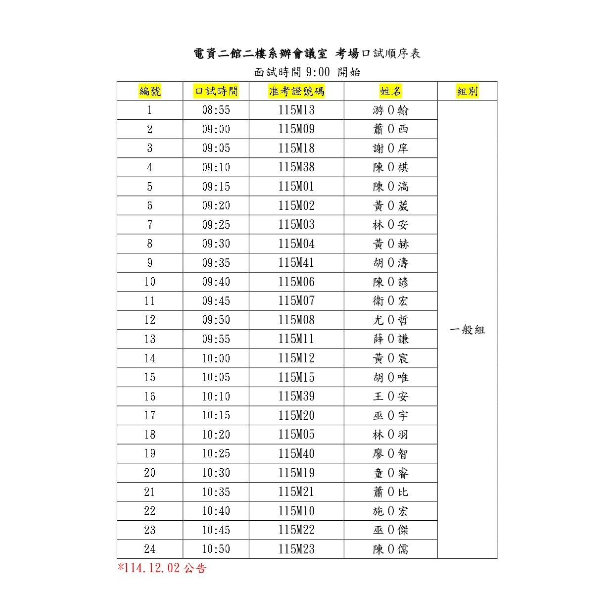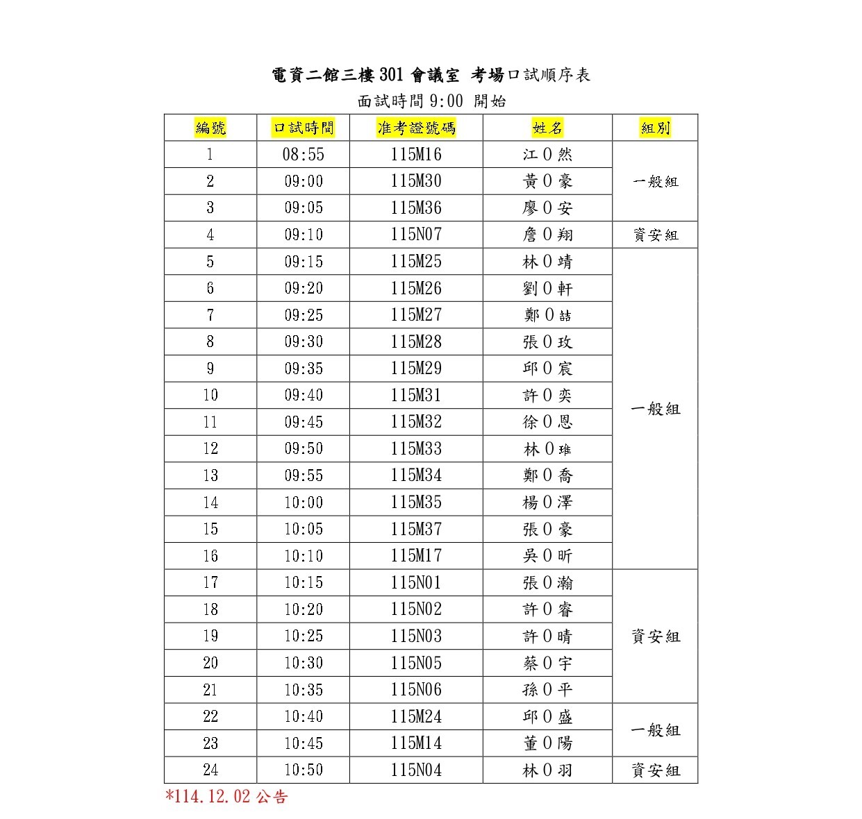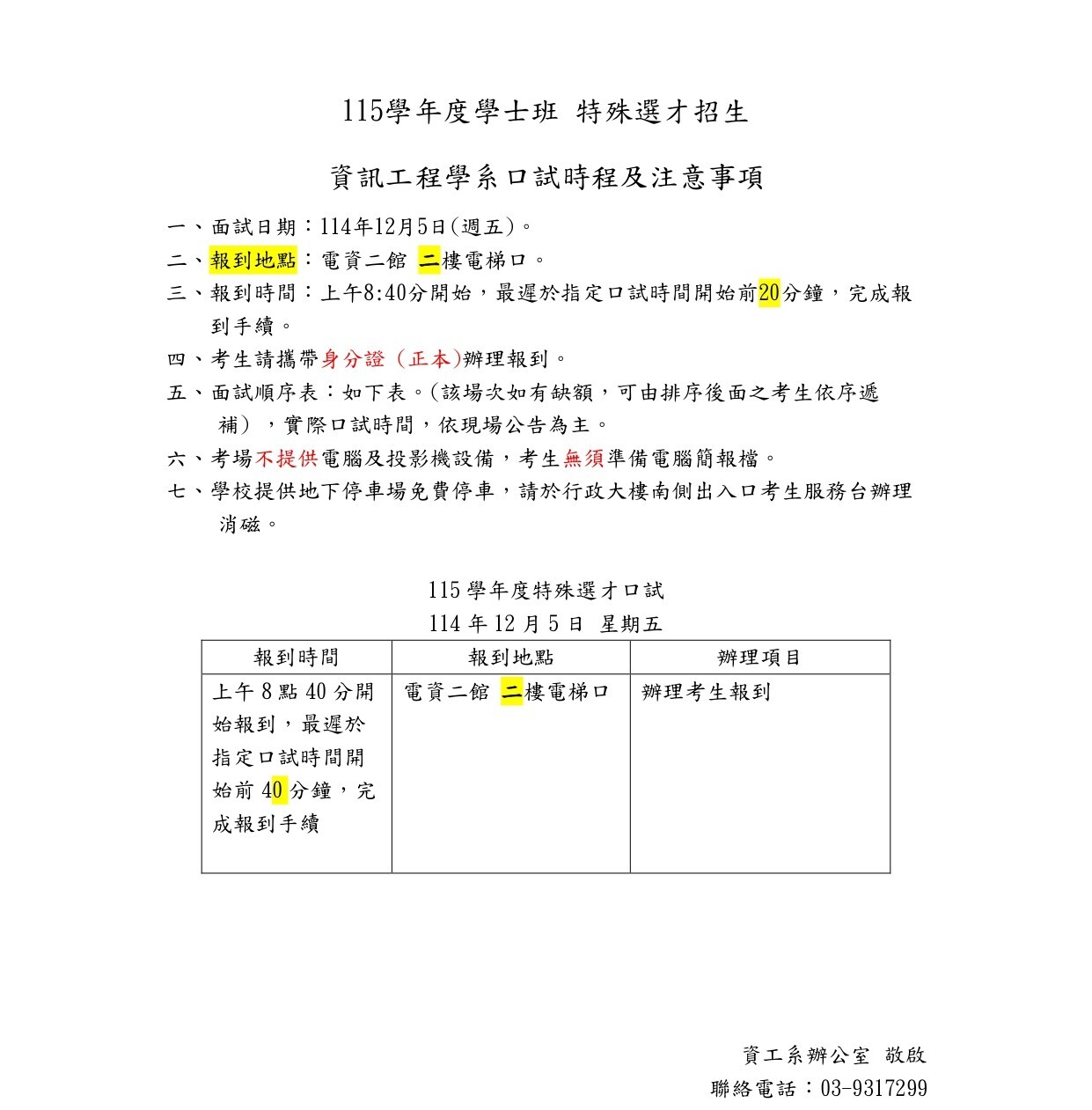 【招生】國立宜蘭大學資訊工程學系學士班115學年度特殊選才口試時間表(12/2更新)